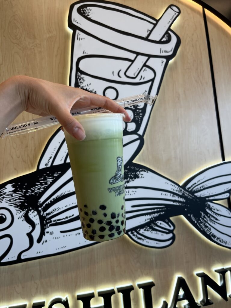 Details: Matcha Latte Macchiato; with boba; COLD; no ice; 30% sugar; from Wushiland Boba (Irvine)