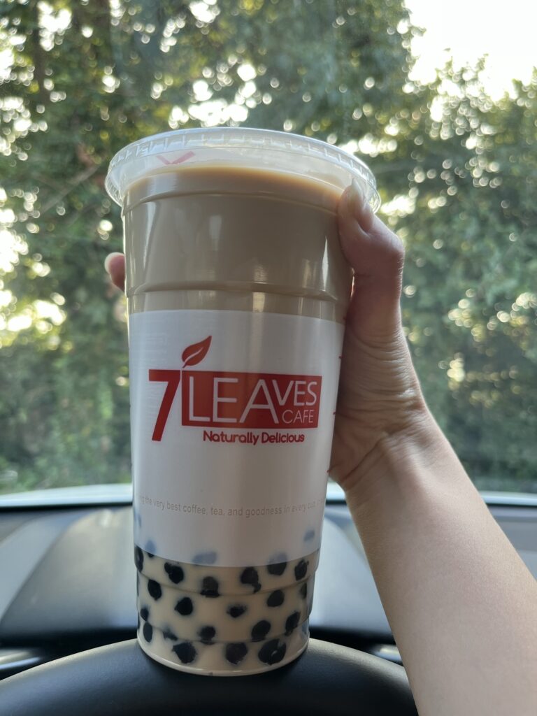 Details: Jasmine Milk Tea; Upsize; Easy Sweet; No ice; with honey boba; from 7 Leaves Cafe (Irvine)